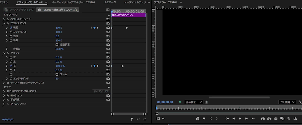 動画をご覧いただきますと一目瞭然かと思うのですが、「明度」を「100」から「0」にする効果と、エッジを少しぼかしたクロップの組み合わせでして、左から右に出てくるパターンではキーフレームを4つ打つだけ、中央から左右に広がるパターンでも6つのキーフレームで作ることができます。