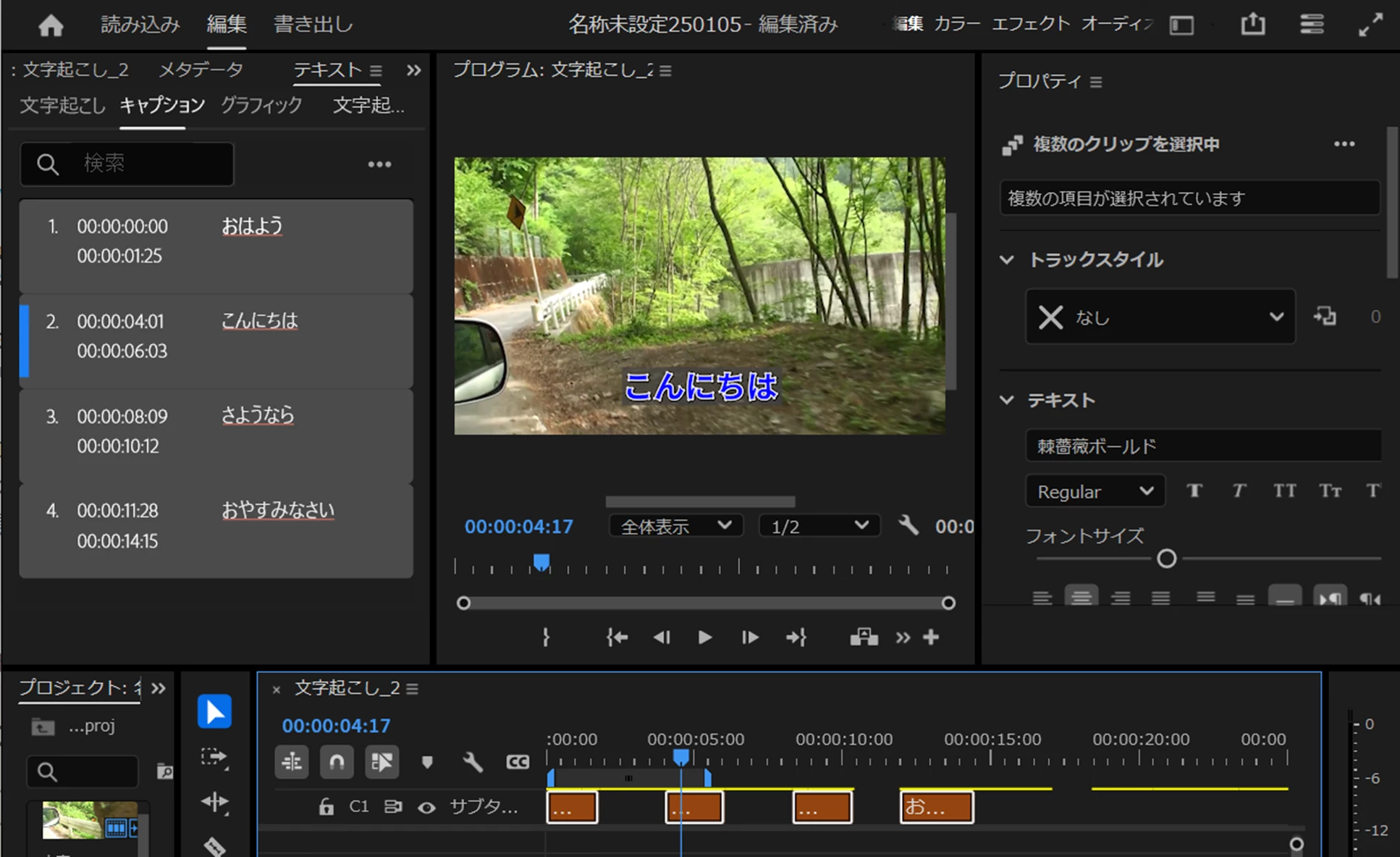 ・キャプションセグメントクリップをすべて選択し、「プロパティ」パネルで必要に応じてフォント、フォントサイズ、色等の変更、境界線・背景追加等を行います。