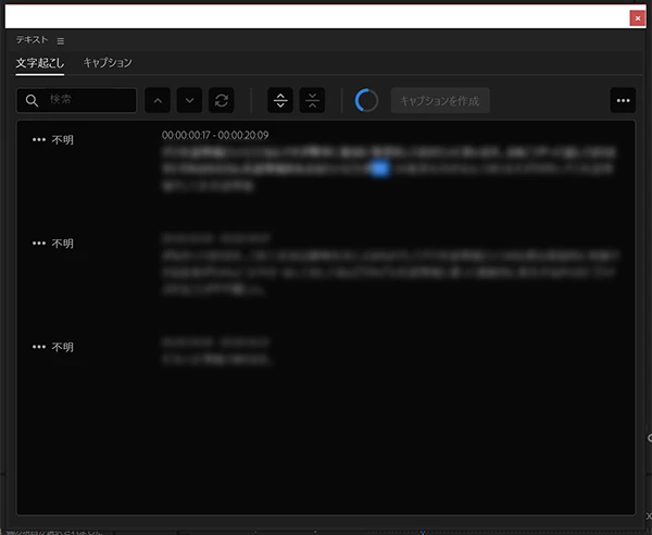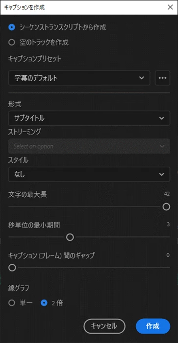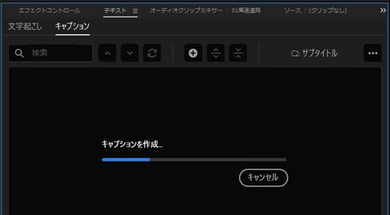 ①「文字起こし」タブで「キャプションの作成」をクリックした後表示される「キャプションを作成」ウィンドウは下図のように設定されているでしょうか。念のため確認をお願いします。