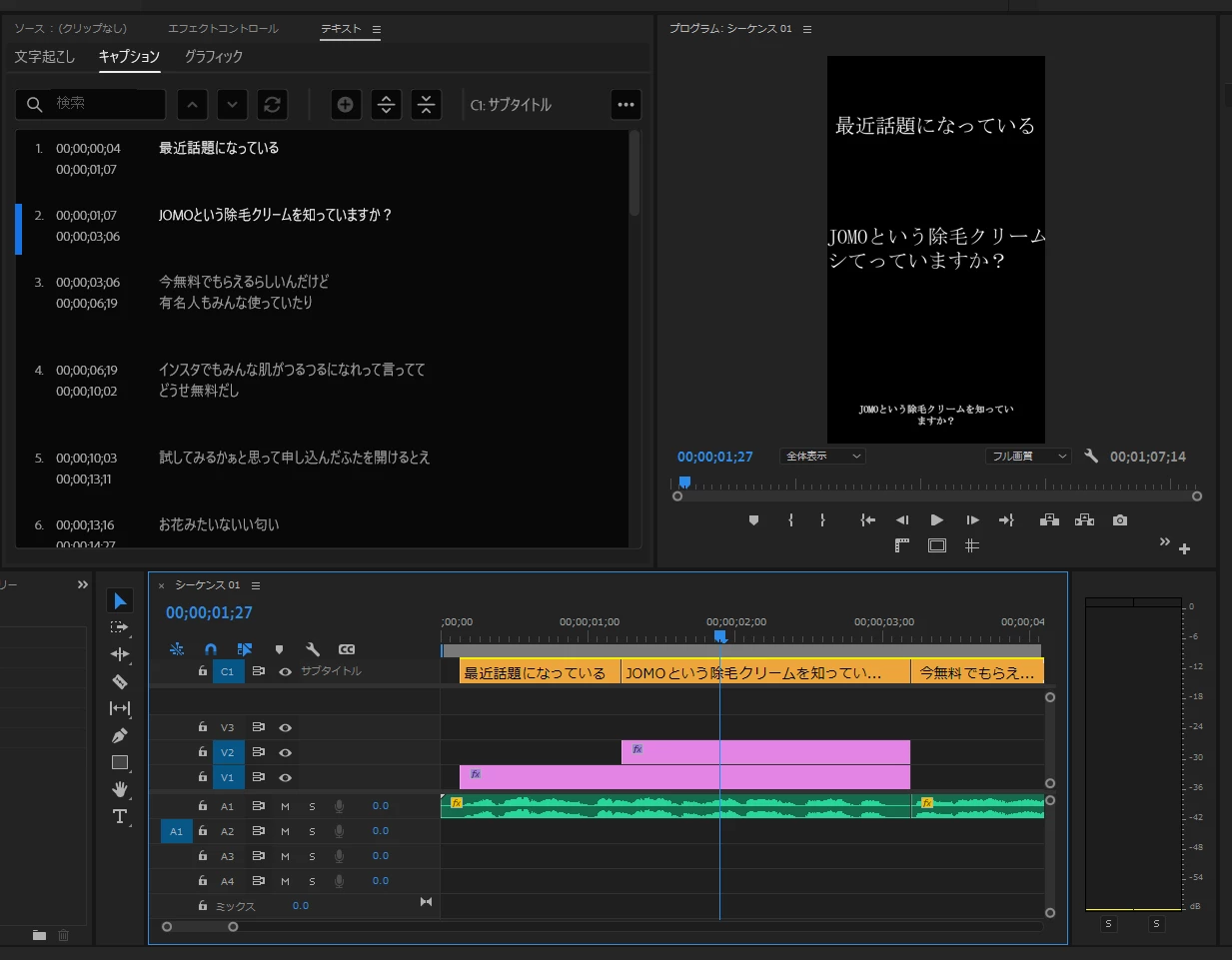 ③速度を変更すると、音声クリップのデュレーションは伸縮しますがキャプショントラックのキャプションセグメントは移動しません。その場合はキャプションセグメントをドラッグして移動したりデュレーションを調整する必要があると思います。