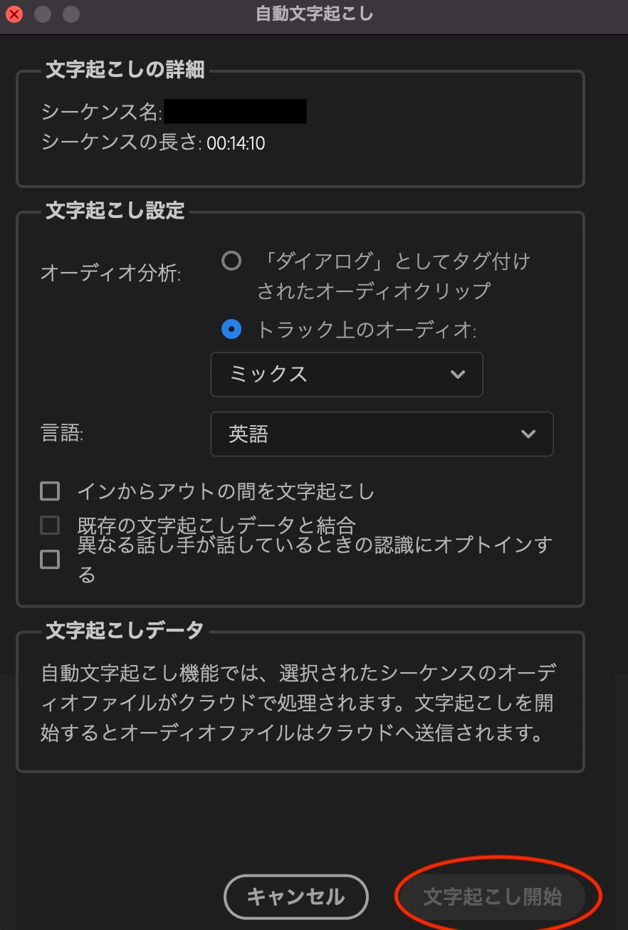 シーケンスからの文字起こし、テキストの文字起こし機能を使用したいのですが、グレーアウトして先に進みません。
