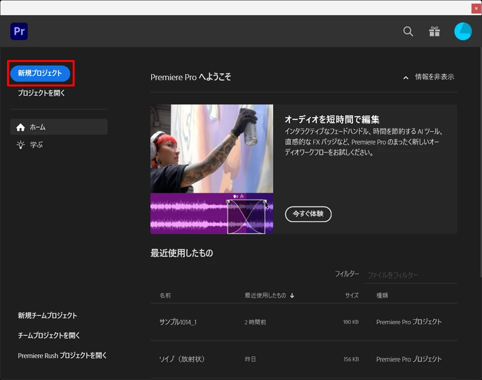 ①Premiere Proを起動します。