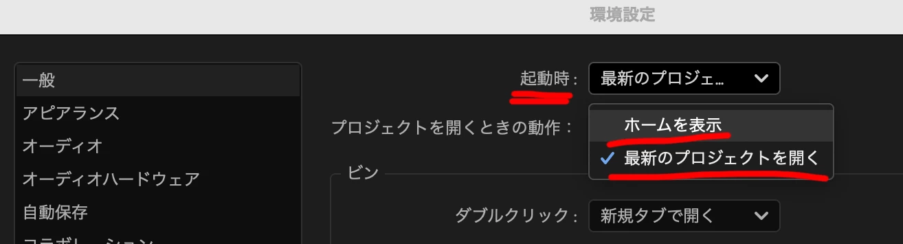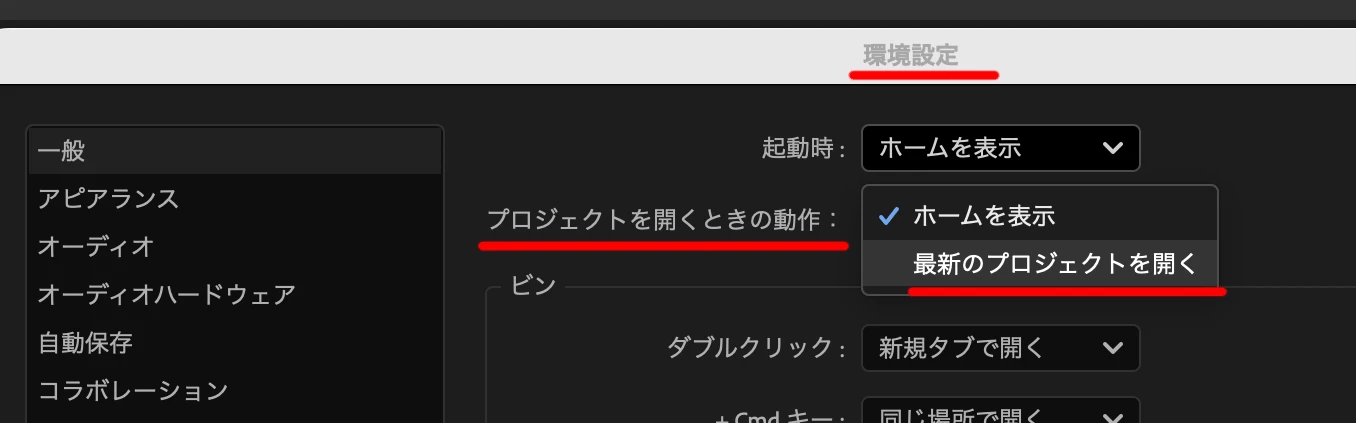 Premiere Pro起動時に、自動的に前回編集していたプロジェクトが開かれる場合には、環境設定でそのように設定されている可能性があります。