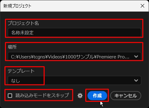 通常は、「プロジェクト名」を入力し、「場所」を指定し、「テンプレート」は「なし」、「読み込みモードをスキップ」はチェックなしで、「作成」をクリックします。