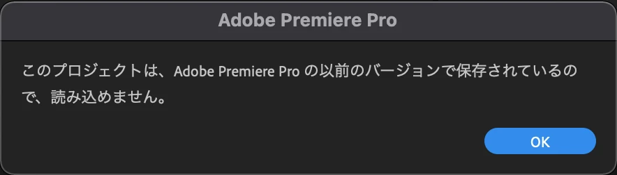 「このプロジェクトは、Adobe Premiere Pro の以前のバージョンで保存されているので、読み込めません。」と表示され、該当のファイルが読み込めません。