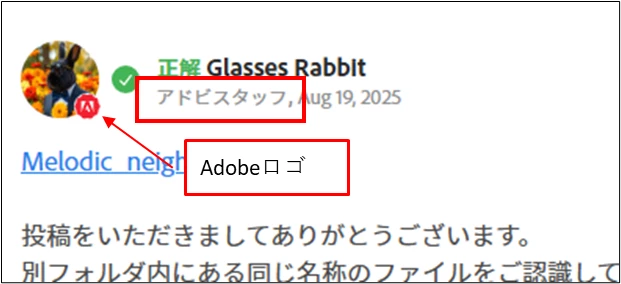 アドビスタッフの方はプロフィールアイコンの右下にアドビのロゴが付いています。スクリーンネームの下へは「アドビスタッフ」等と記載があります。