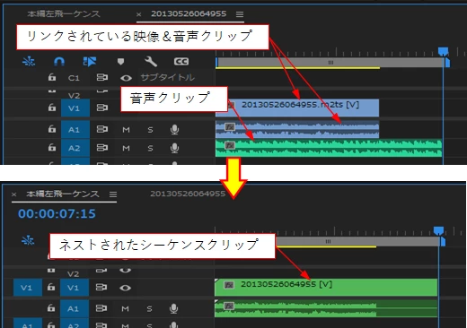 ①リンクされている映像&音声クリップに対し、さらに音声クリップを追加したシーケンス(下上図)を本編のシーケンスにネストします。