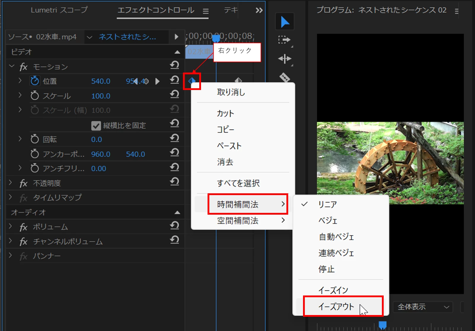 その場合なら、左側のキーフレームの上で右クリックして開いたメニューから「時間補間法」⇒「イーズアウト」、右側のキーフレームの上で右クリックして開いたメニューから「時間補間法」⇒「イーズイン」を選択します。