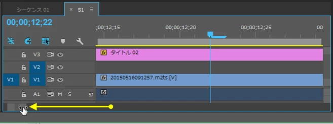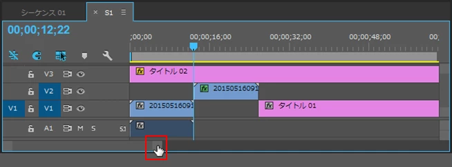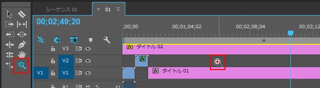 ※別方法として、ツールパネルの「ズームツール」を選択し、タイムラインパネルのトラック内でクリックすると、時間軸表示が拡大します。「Alt」(Macは「option」)キーを押しながらクリックすると縮小します。