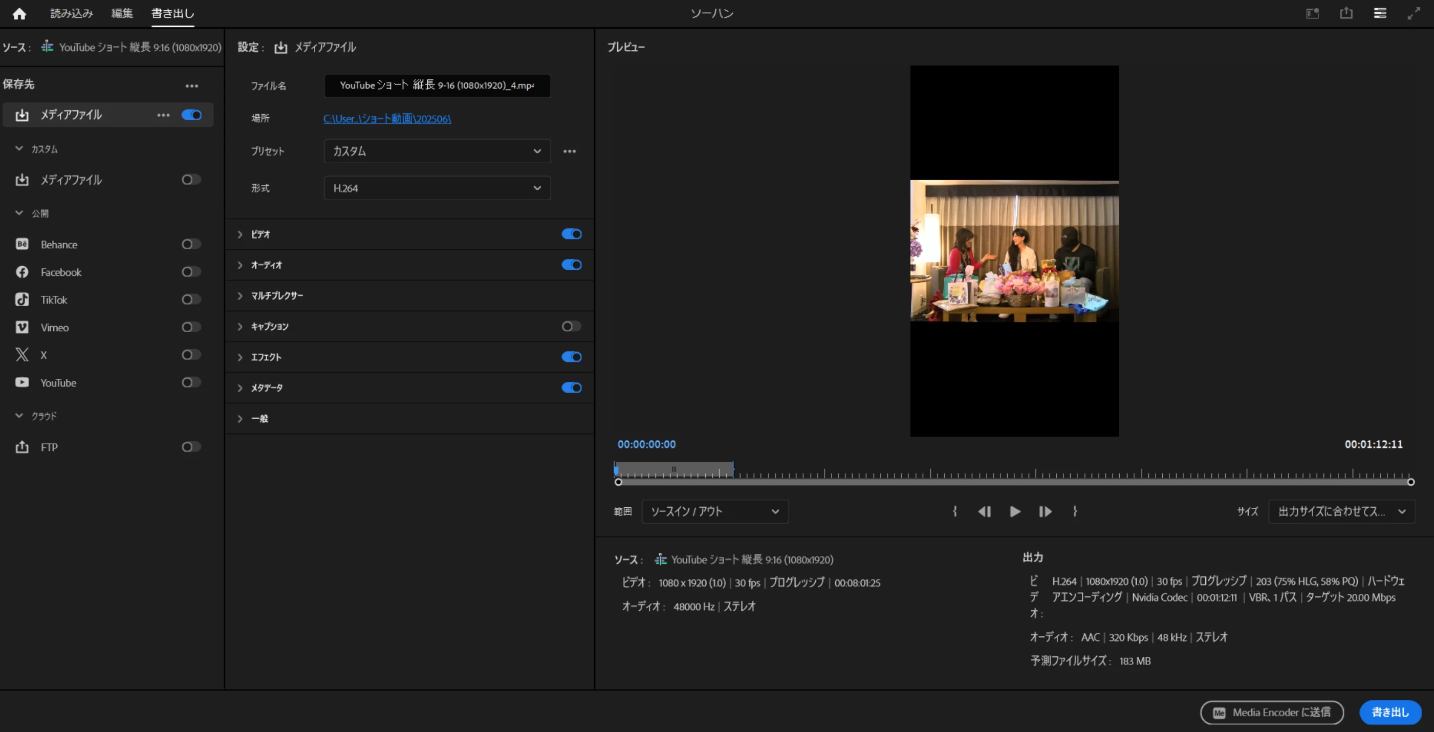 プリセット:カスタム、形式:H264で書き出しています。