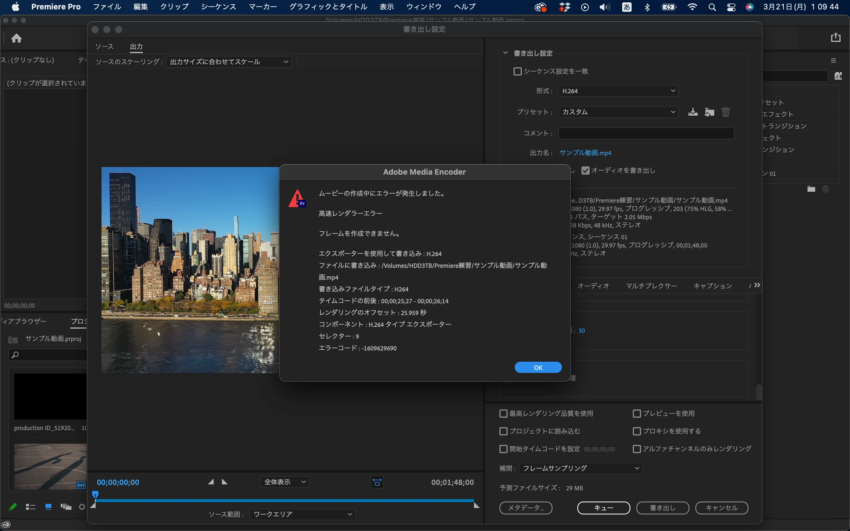 もう一つの方法は、シーケンス上でエラーメッセージにあるタイムコードの範囲にある素材(もしくはエフェクトの組み合わせ)に問題があるかもしれないので、その部分で対処することで改善できる可能性もあります。