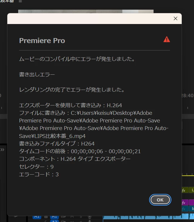 書き出しの際に出るエラーが写真の通りです。何回か試したところ該当する時間は少し変わりますがおおよそ同じ時間の部分でエラーが出ます。ただ他のファイルを試しに書き出してみようとしたところ同じエラーが出て出来ませんでした(以前は書き出すことが出来て変更をほぼ行っていないプロジェクト)。エラーの解決策について教えていただきたいです(個人的にはタイムラインにはそんなに原因はないのではないかと思っています)