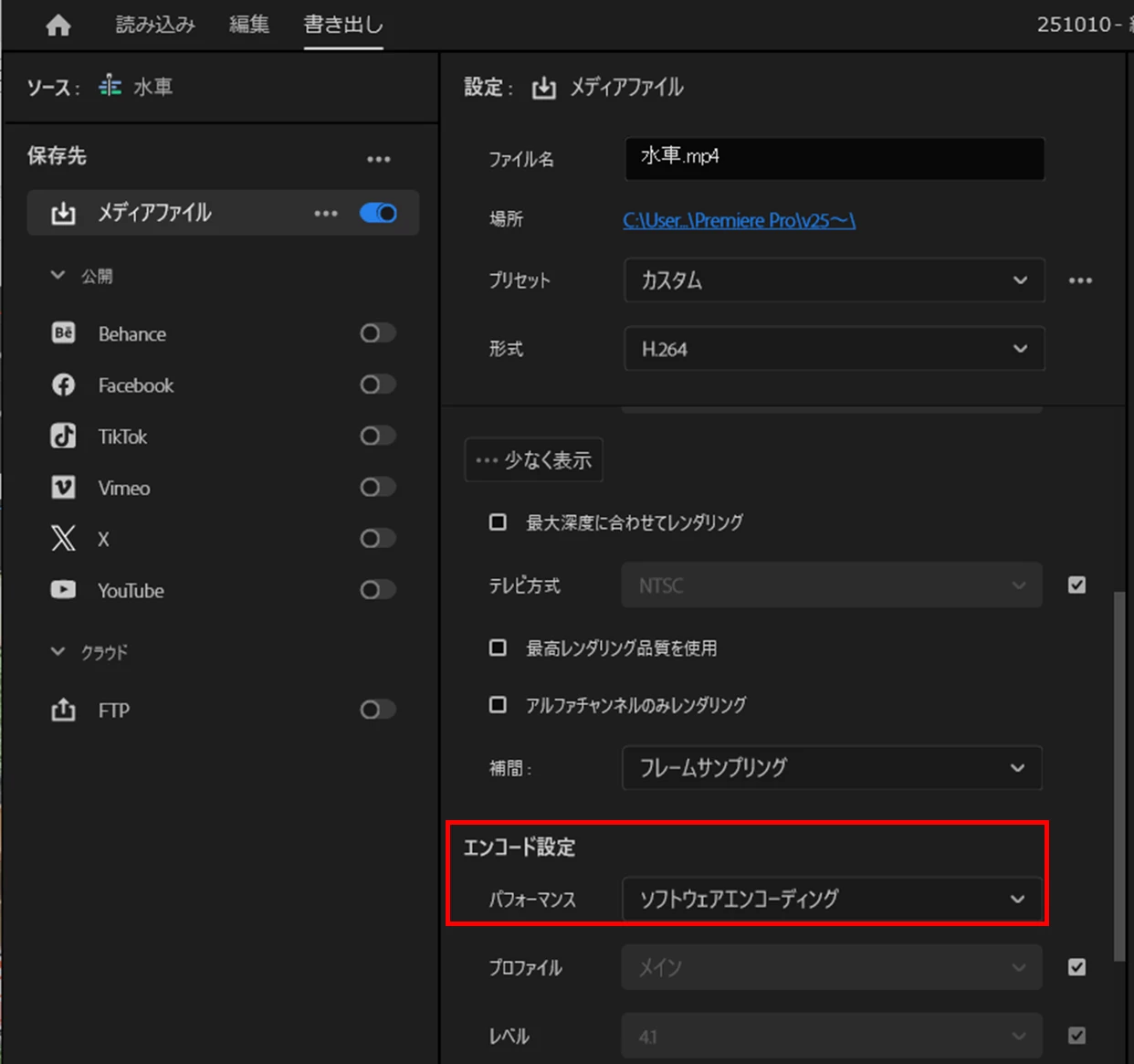書き出し画面で、中央列の中ほどよりやや下にある「・・・その他」ボタンをクリックすると「・・・少なく表示」に変わります。続いて下にスクロールし「エンコード設定」項の「パフォーマンス」を「ソフトウェアエンコーディング」に設定します。