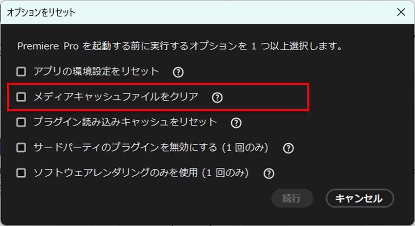 ⇒Ctrl(windows)、command(macOS)キーを押しながらPremiere Proを起動し、開いた「オプションをリセット」ウィンドウで「メディアキャッシュファイルをクリア」にチェックを入れ「続行」をクリックします。