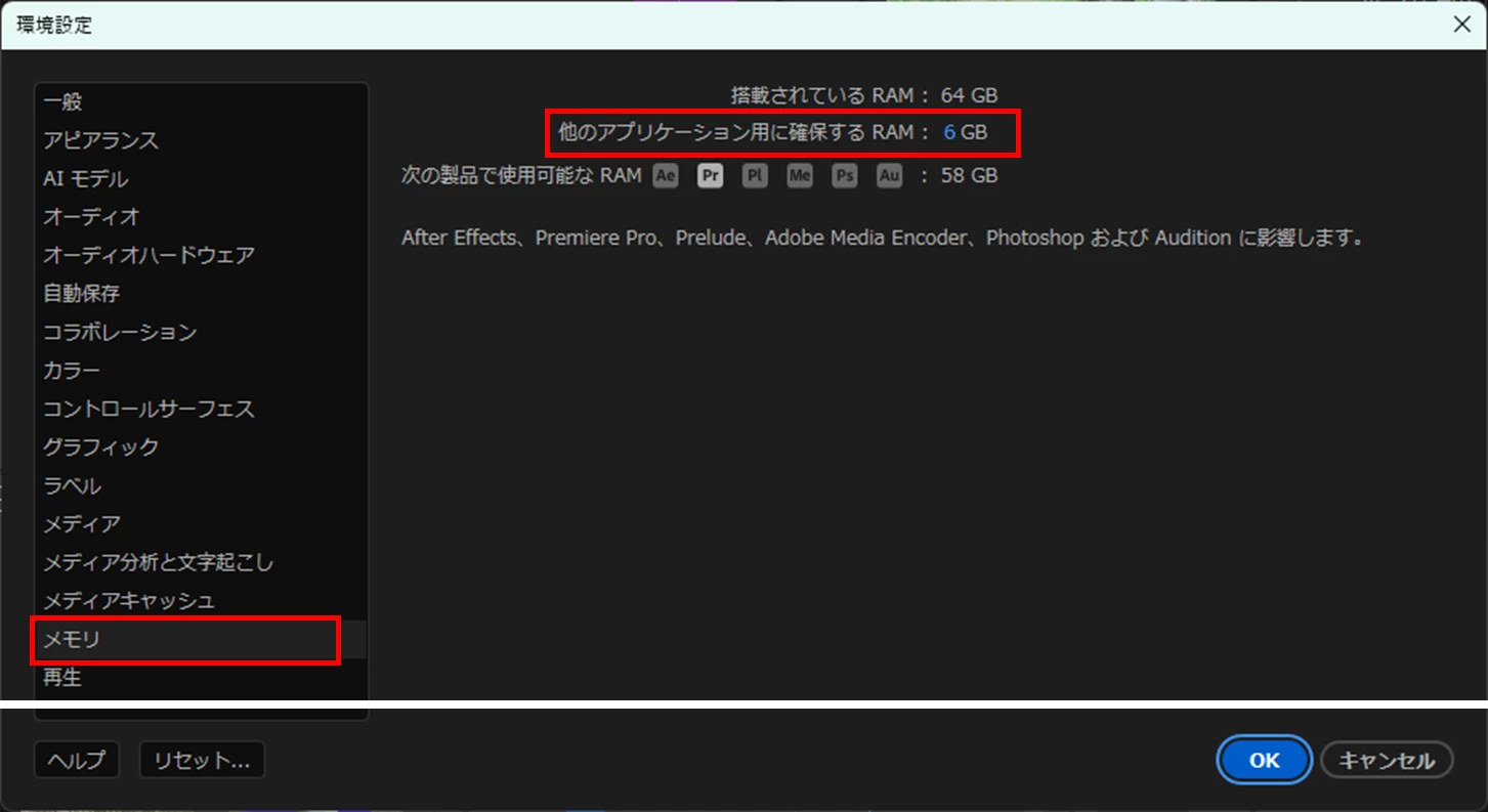 ②Premiere Proに割り当てるRAM量が少ない場合は増やしてみます。