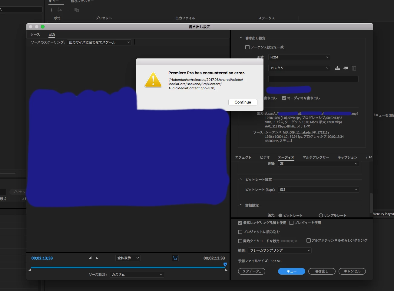 プレミアで書き出しの「キュー」をクリックすると、画像のようなエラーが出てしまいます。