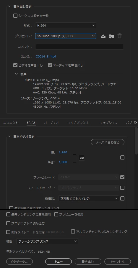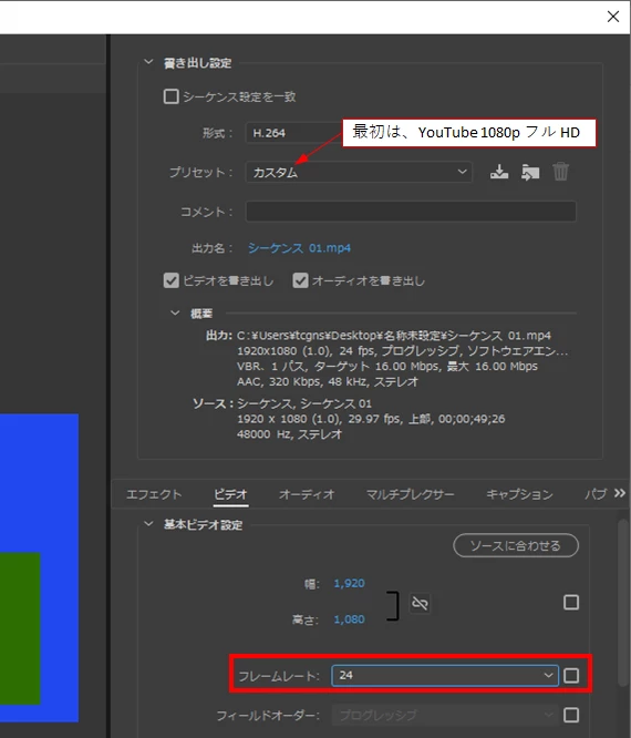 「Youtube 1080p フルHD」はシーケンス設定ではなく、書き出し設定ですよね。