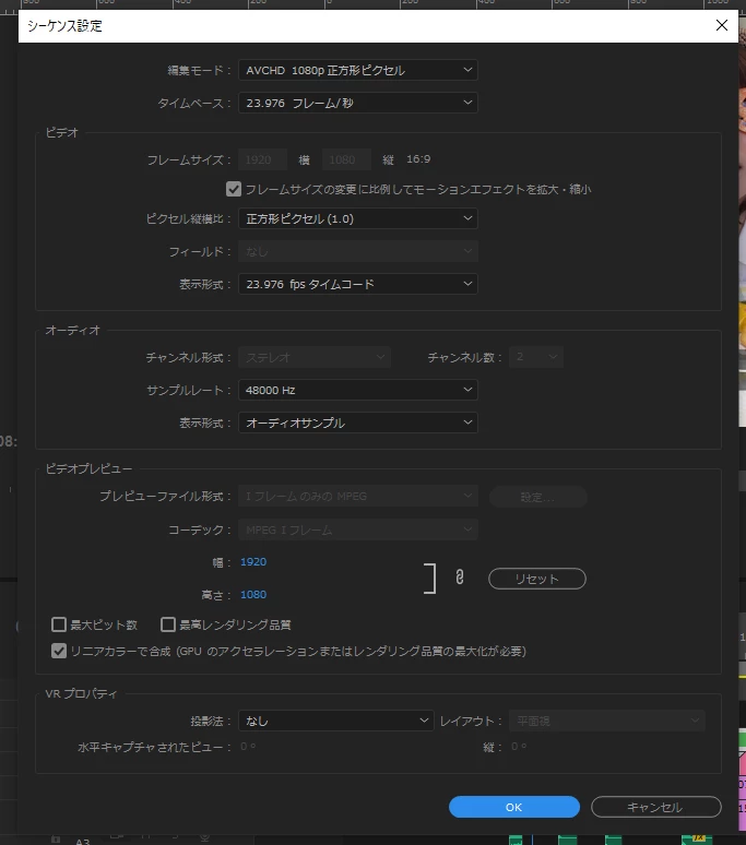 シーケンス設定ではプリセットの「Youtube 1080p フルHD」を選択しています。