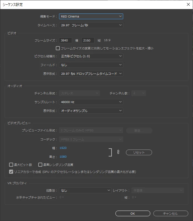 編集モードは「RED Cinema」になっています。私の場合はフレームレートは全て29.97fpsです。