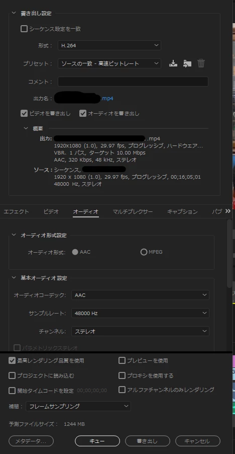 書き出し設定は添付ファイルの通りで、いつもこの形式で書き出していますが問題なく再生できています。