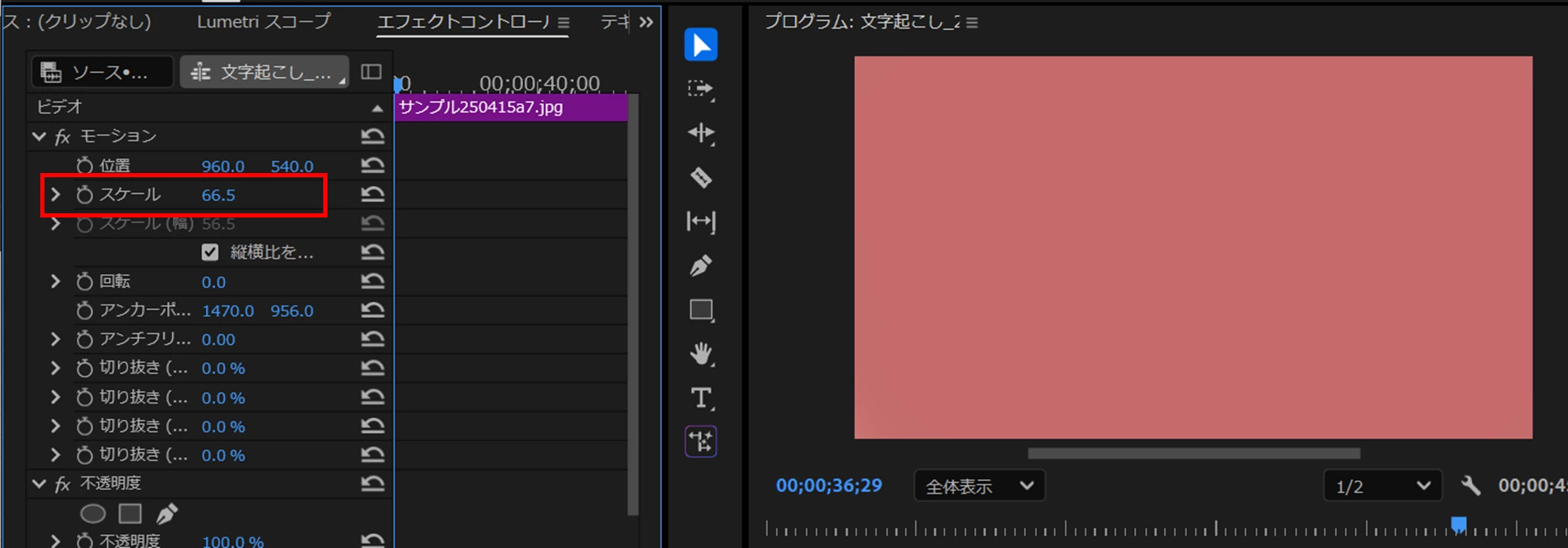 「出力サイズ全体にスケール」を選ぶと左右の黒枠は消えるのですが文字がテロップが途切れて見えてしまい、