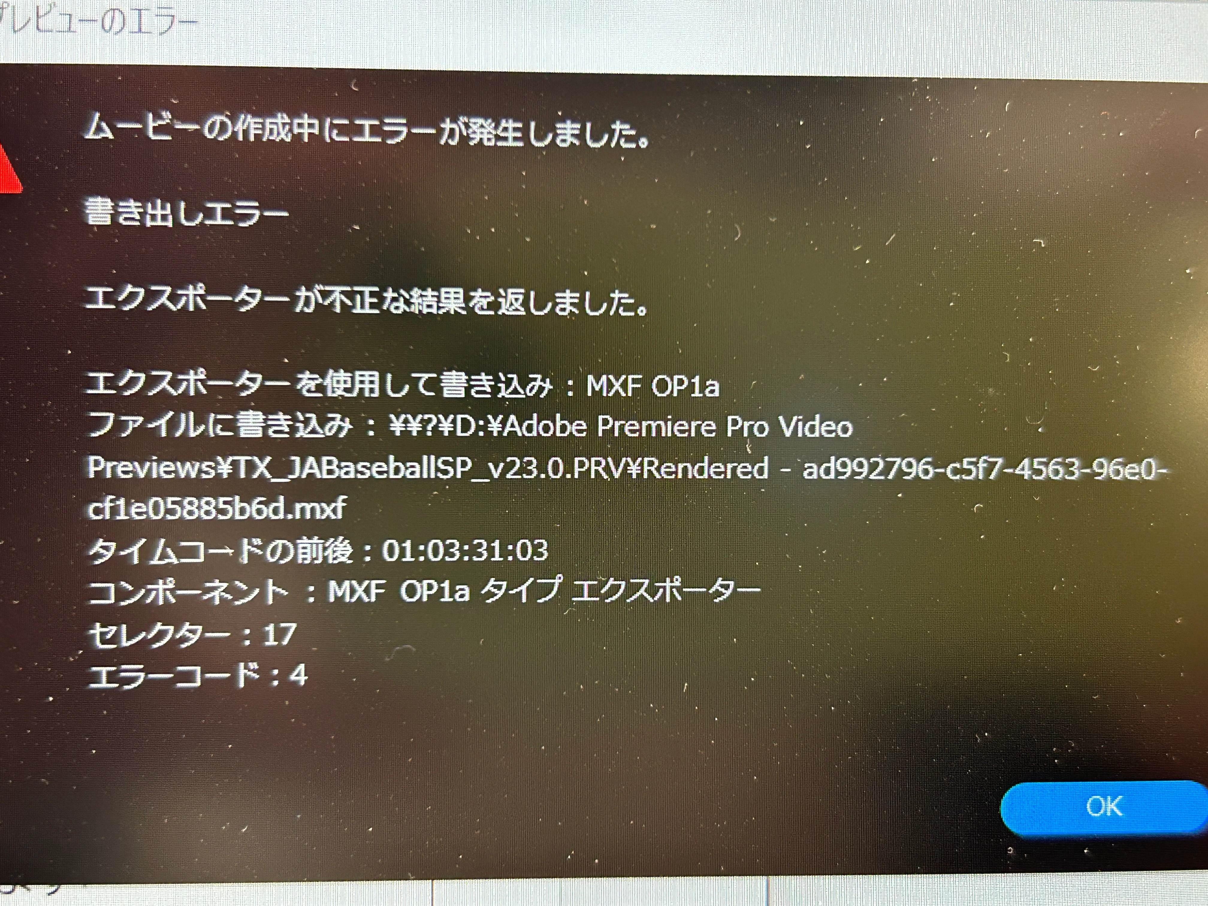 平成最後の侍InspiringForum|Forum|2 years agoDecember 12, 2023Question書き出し時のエラーについてForum|Forum|2 years agoDecember 12, 20231 reply165 viewsレンダリングを仕掛けたら、これまで出ていなかったのですが、初めてエラーが出ました。写メを添付いたします。解決方法がございましたら、ご教示ください。宜しくお願い致します。 OS Windows11、バージョン23.0です。エラー・問題