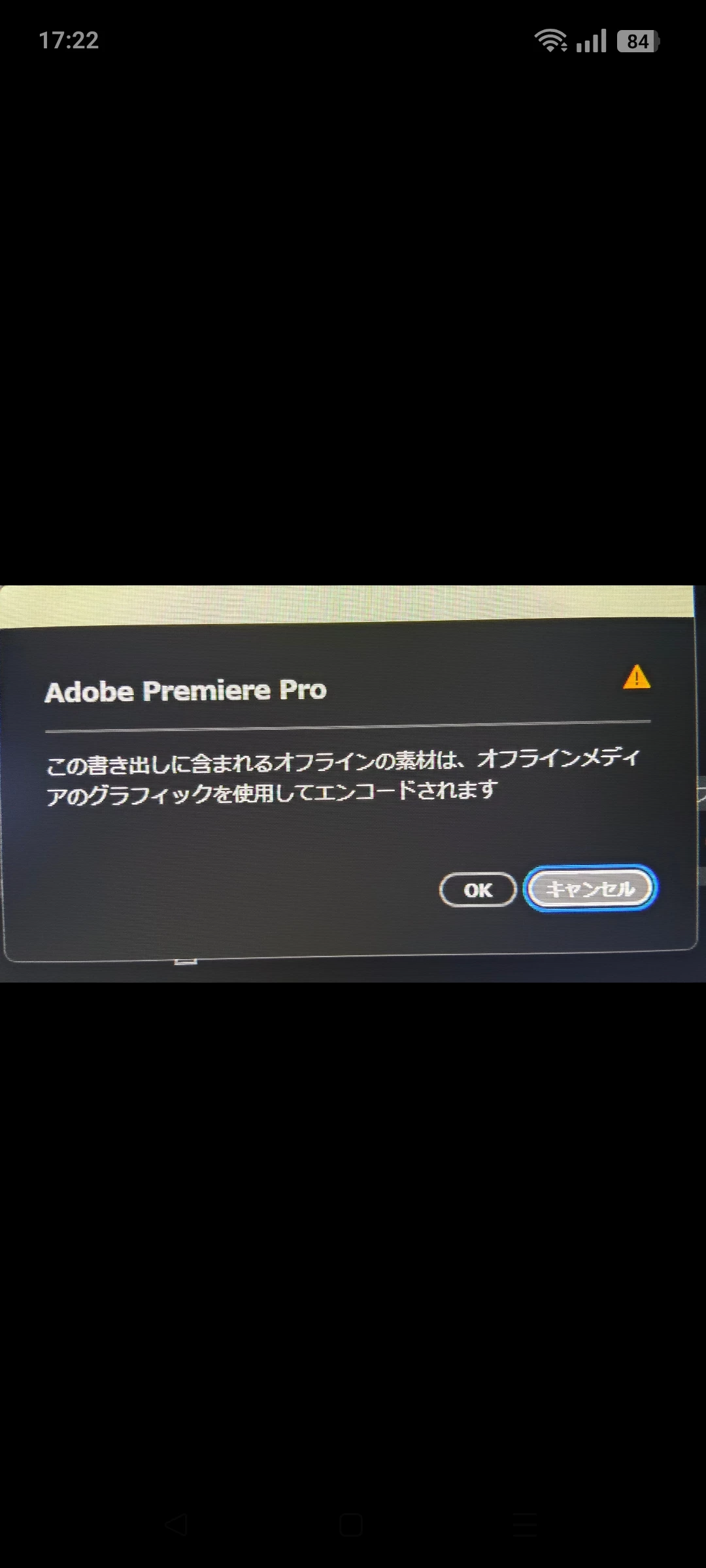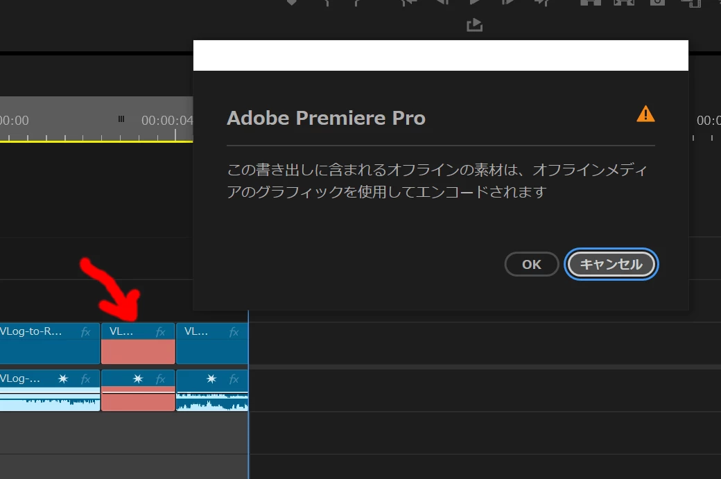 このメッセージが出ている場合、シーケンスで使用されている素材の中に、「オフラインになっている(見つからない)ファイル」があるということになります。