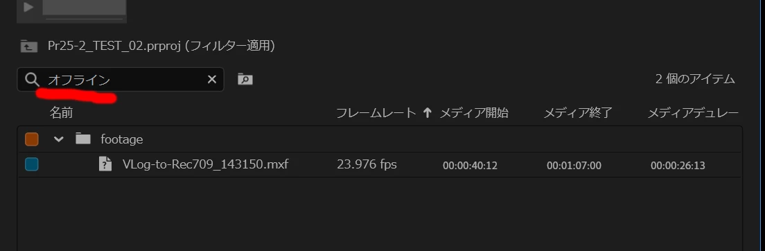 ですので、まずはプロジェクトパネルの検索窓に「オフライン」と入れて検索していただき、プロジェクトの中でオフラインになっている素材を洗い出していただくところから始める必要があるのではないかなと思います。