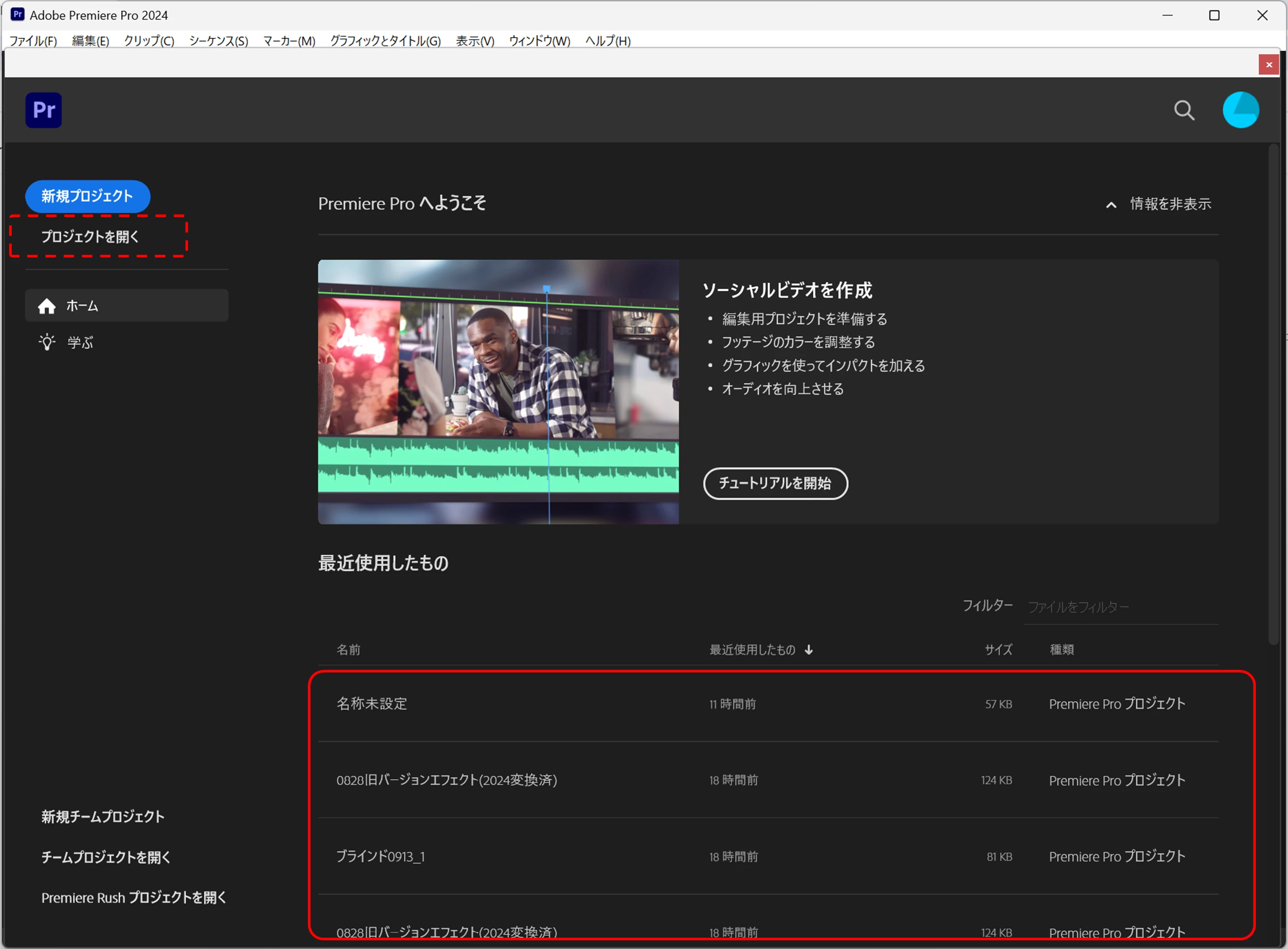 見当たらなければ、左上の「プロジェクトを開く」をクリックしてフォルダーを辿ってプロジェクトファイルが表示されていませんか。