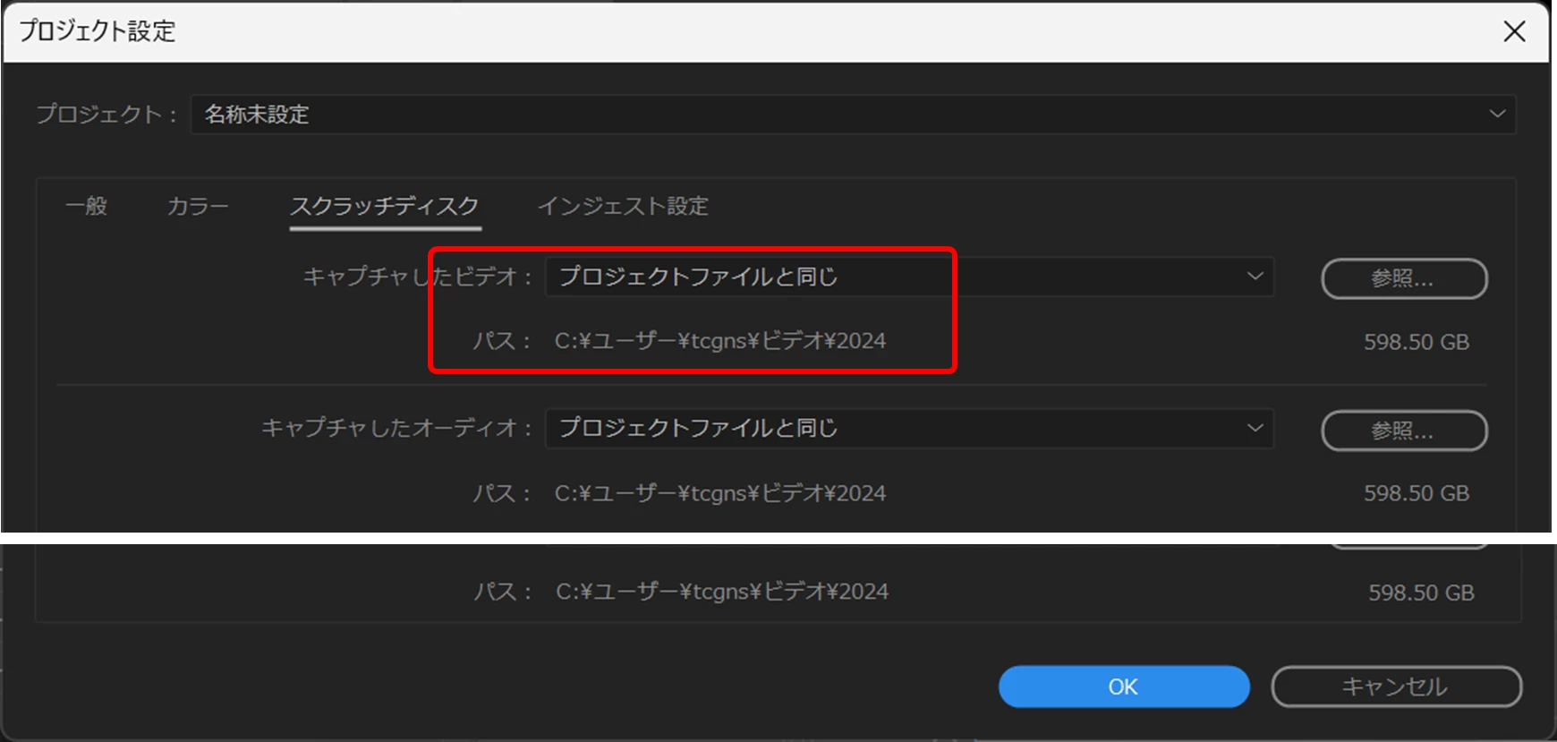 もし、保存したフォルダーが分からなければ、メニューの「ファイル」→「プロジェクト設定」→「スクラッチディスク」を選択し、開いた「プロジェクト設定」ウィンドウで、「プロジェクトファイルと同じ」と記載してあるところのパスをご覧ください(下下図)。