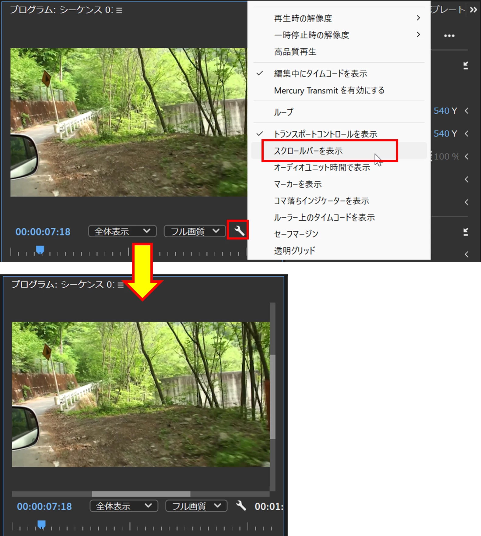 Premiere Pro v24.4.1で廃止になった「ソースモニター」と「プログラムモニター」の「スクロールバー」が v25.0で復活しました。