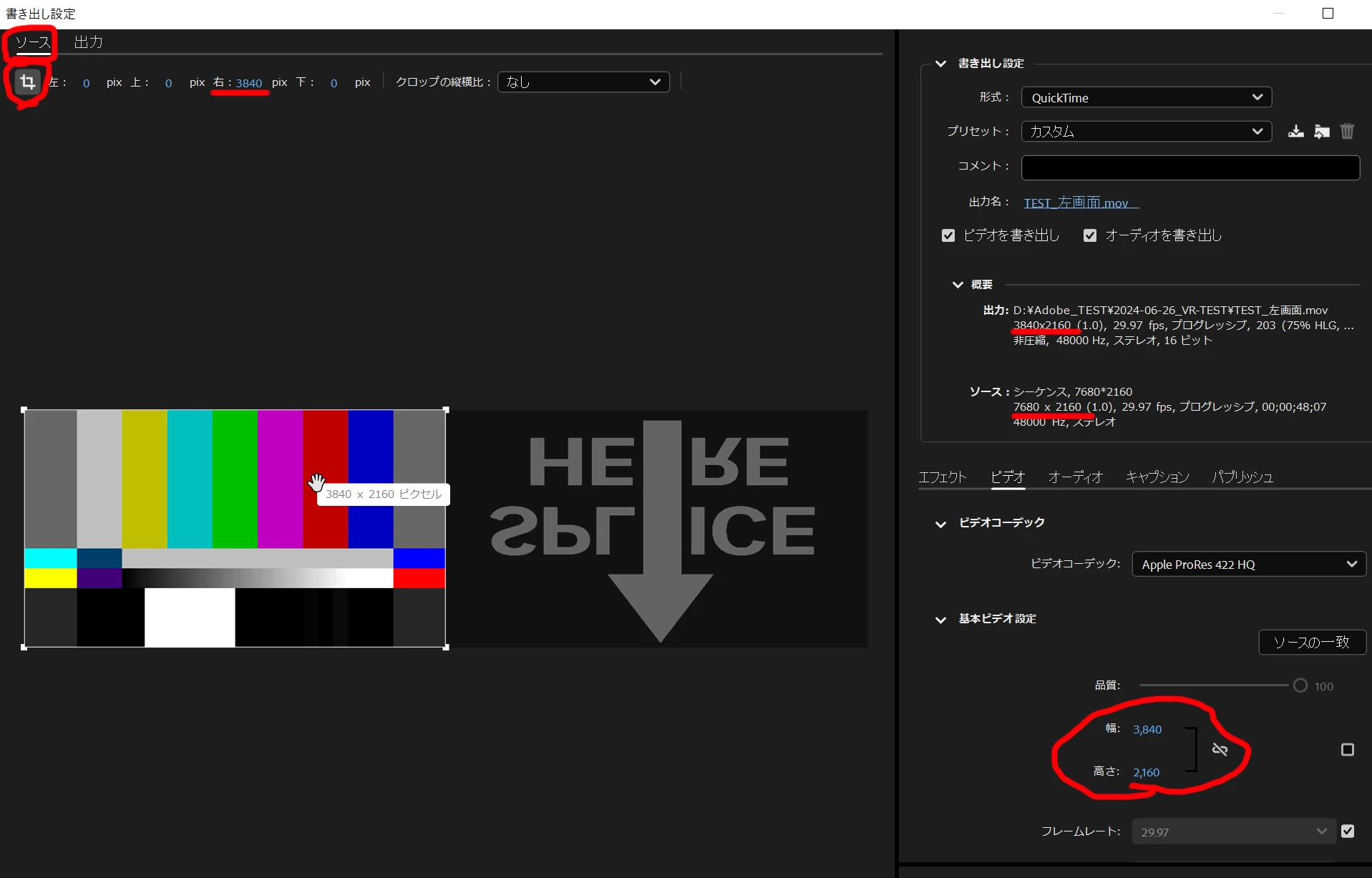 まず、シーケンス設定を7680×2160のサイズとし、素材となる動画(3840×2160)を左右に振り分けながら、編集を始めました(シーケンスAとする)。