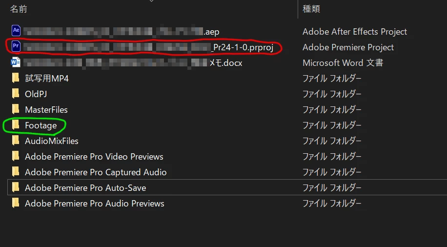 この画像は私が制作している作品(シンプルな記録ビデオ)の例ですが、赤丸で囲っているのがプロジェクトファイルで、撮影素材などは緑丸で囲ったFootageフォルダにすべて入っています。