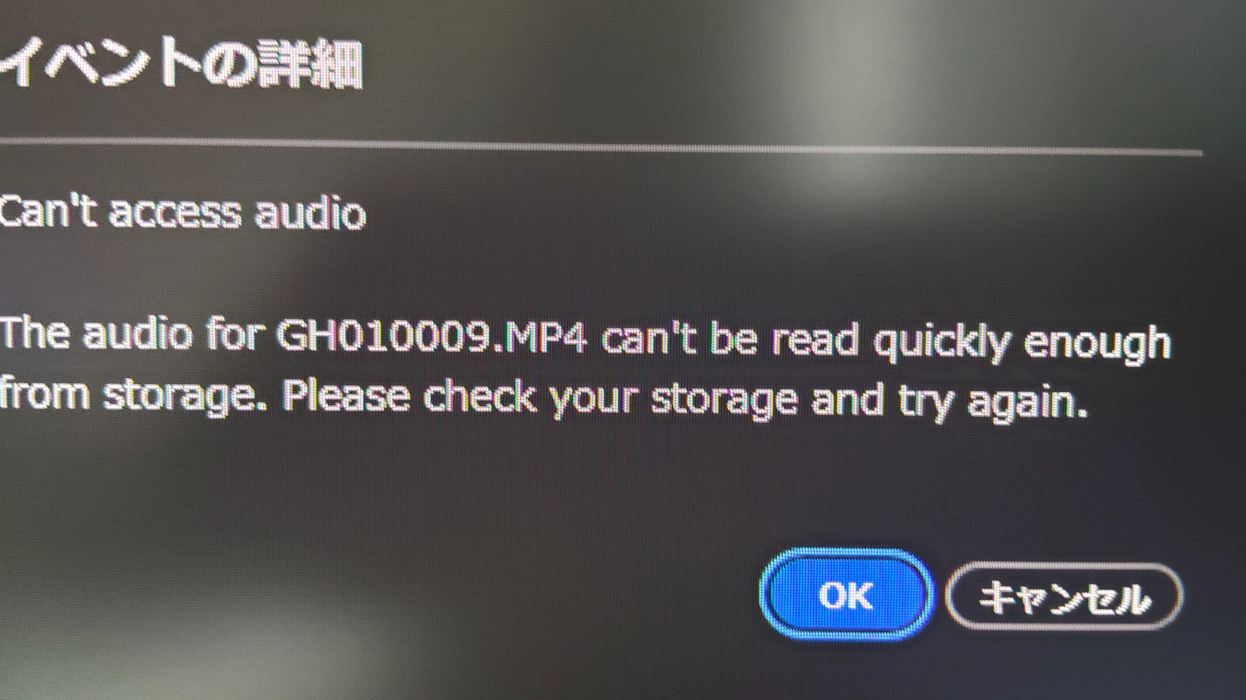 おそらくストレージ(該当するMP4ファイルを保存しているところ)の速度が遅くてオーディオの読み込みが間に合わない、といった内容だと思うのですが、本当にストレージの問題であるか否かは、もう少し様子を見ながら確認する必要があるかもしれません。