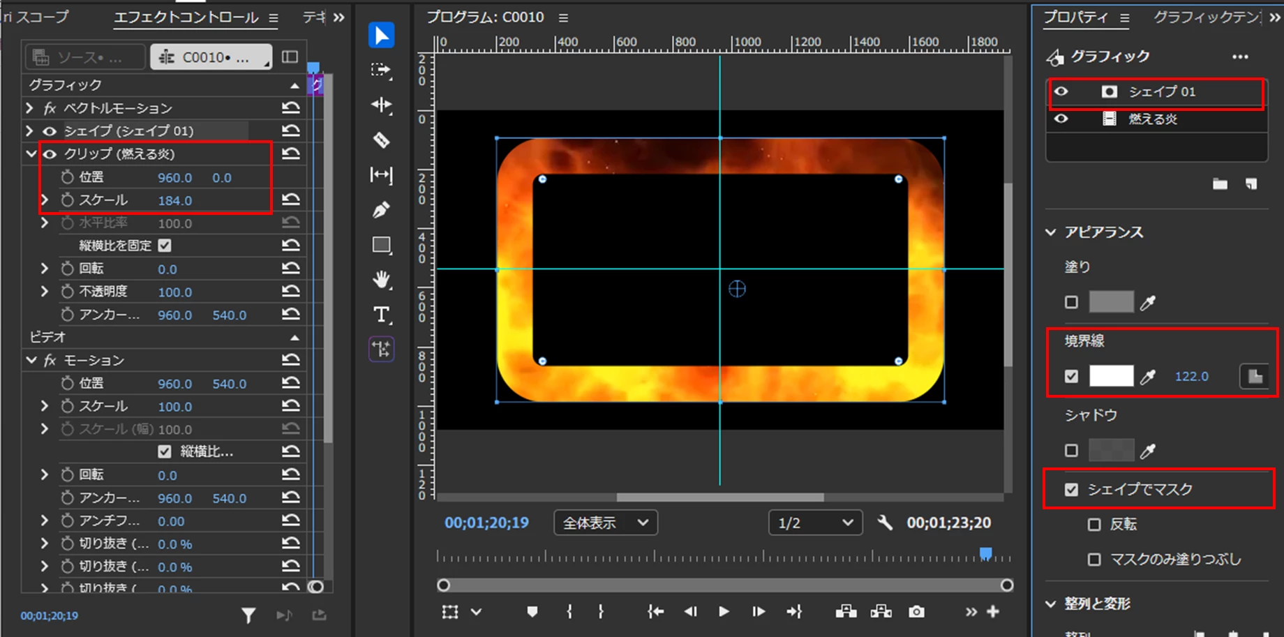 「シェイプでマスク」にチェックを入れます。すると境界線がマスクされ、下のレイヤーの映像(画像)が見えてきます。