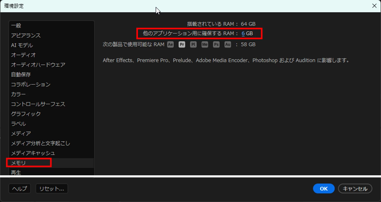 「環境設定」⇒「メモリ」ペインで「他のアプリケーション用に確保するRAM」を「10GB」等になっていましたら最低の「6 GB」にしてみます。これでPremiere Proに割り当てるメモリ量が増加します。