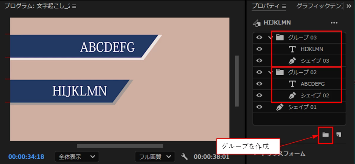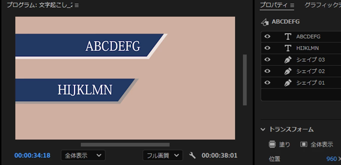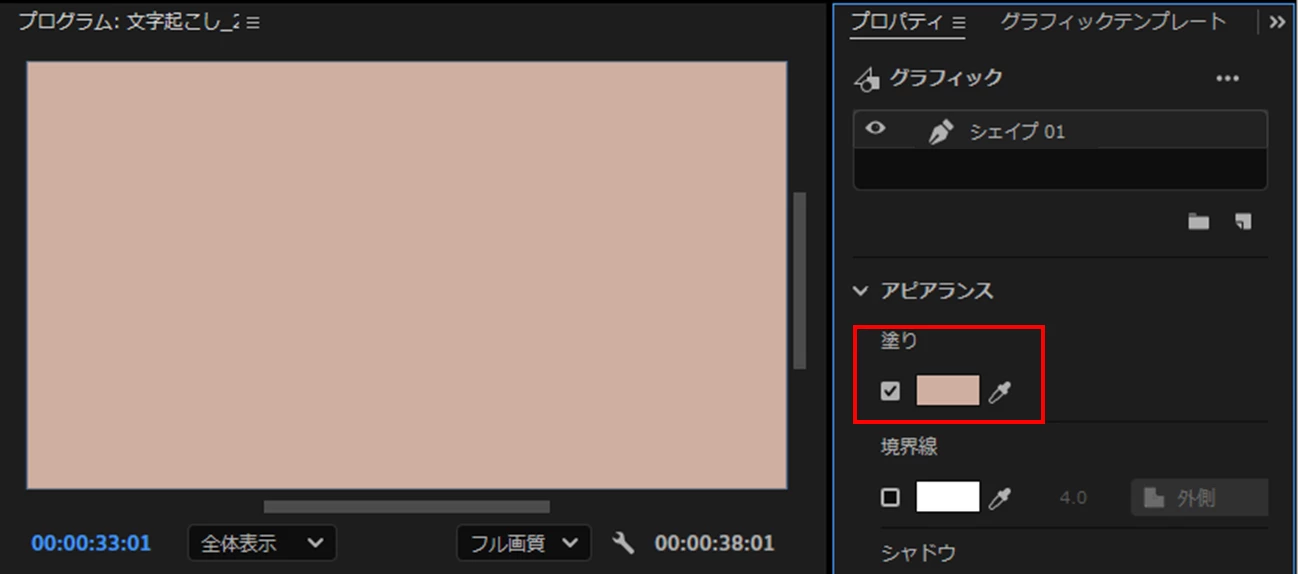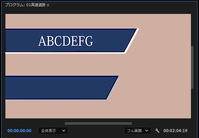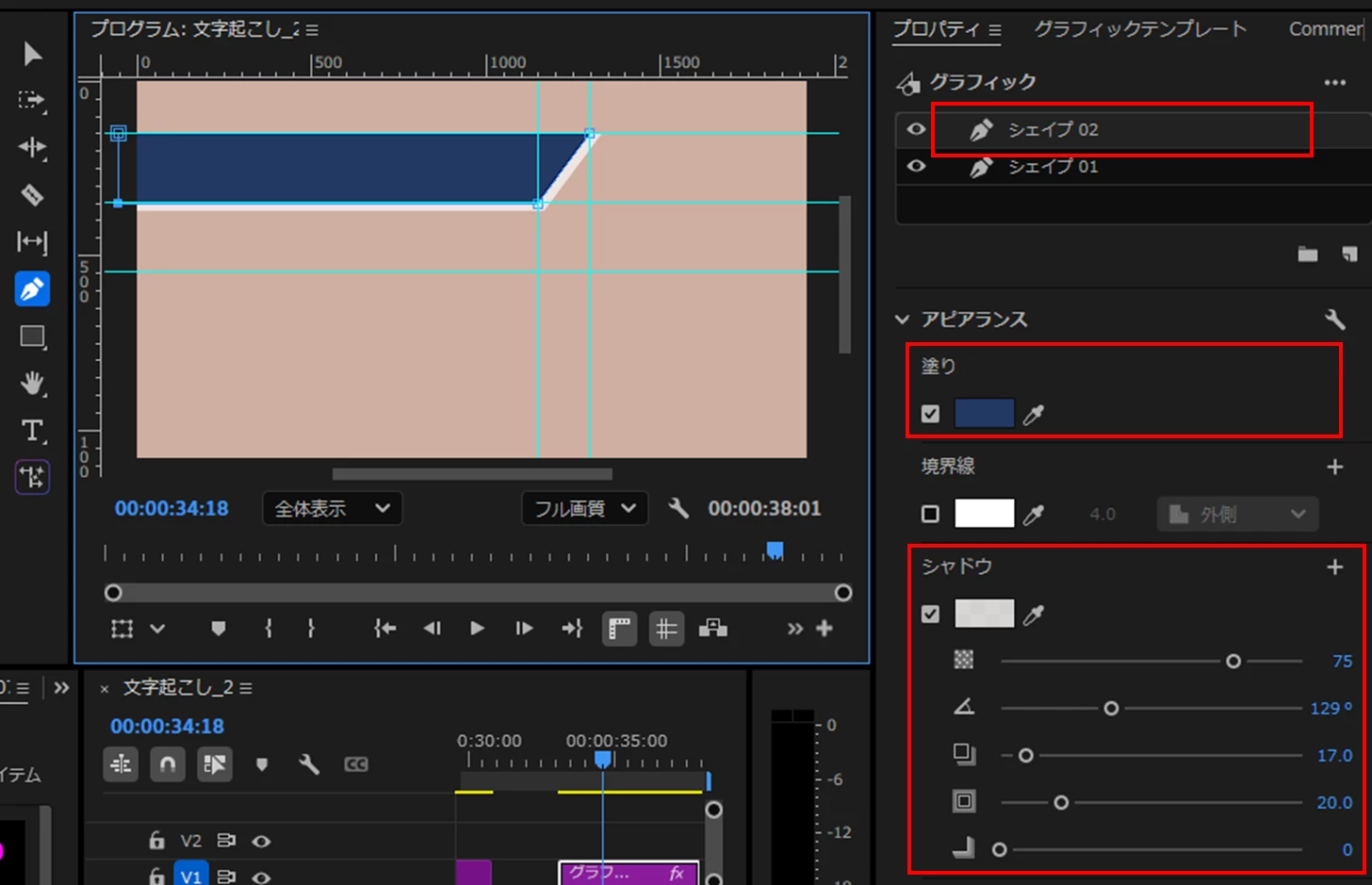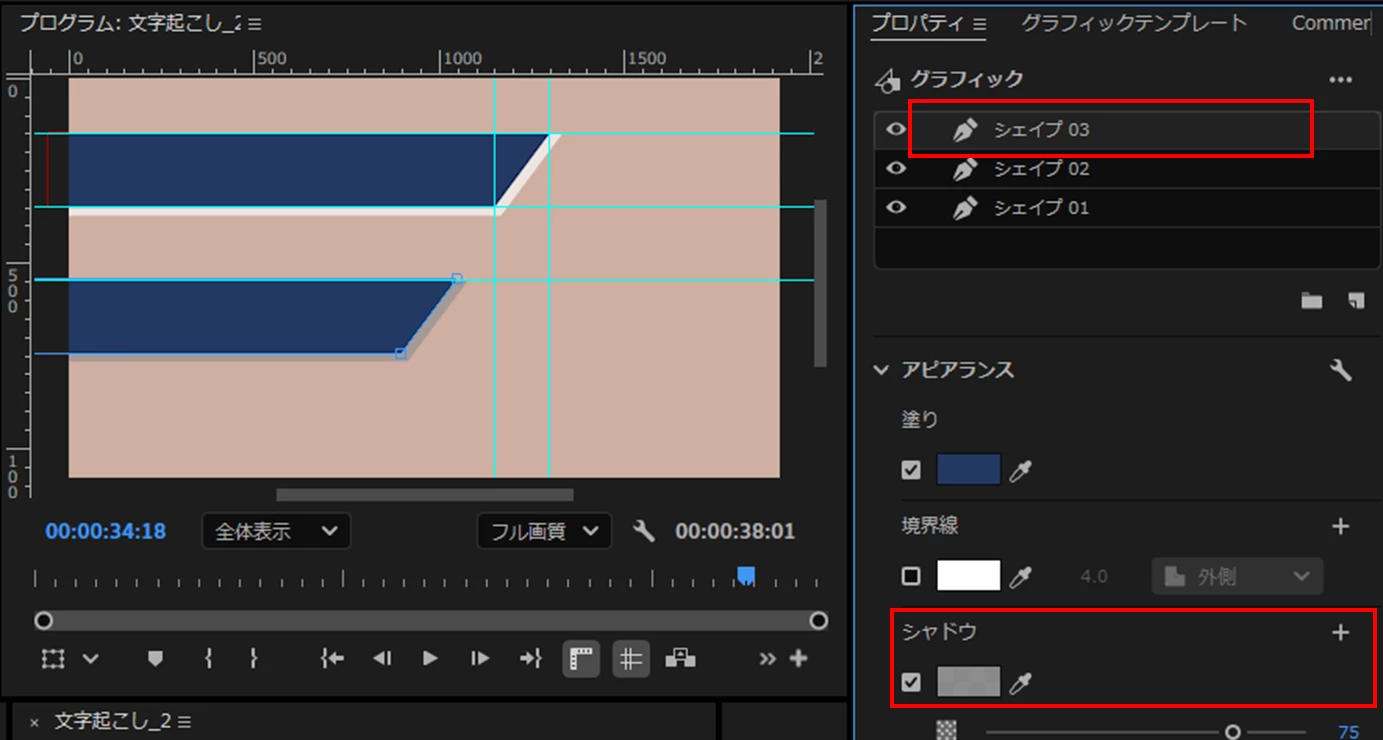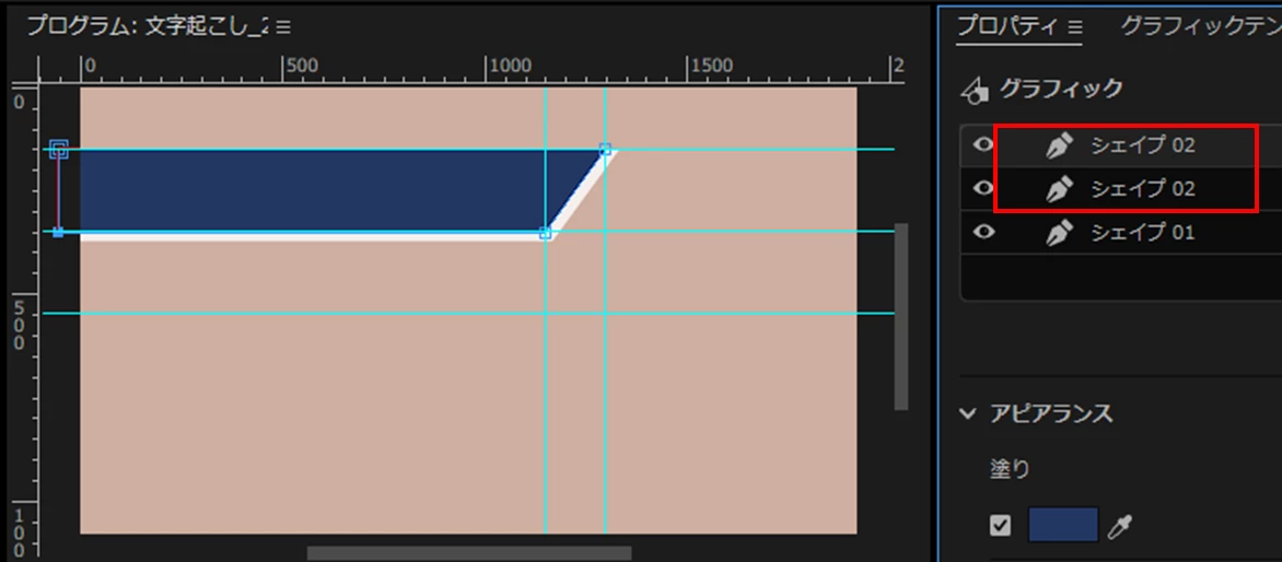 ④すると、「シェイプ02」レイヤーが2個になり、プログラムモニターではテロップの背景が重なって作成されています。