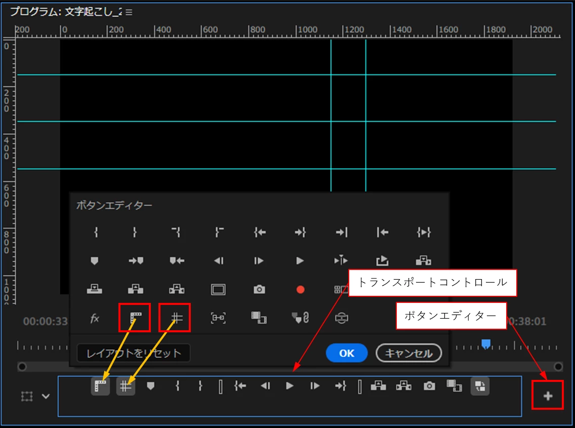 また、「トランスポートコントロール」部に「定規」と「ガイド」のアイコンを表示させておくと便利です。