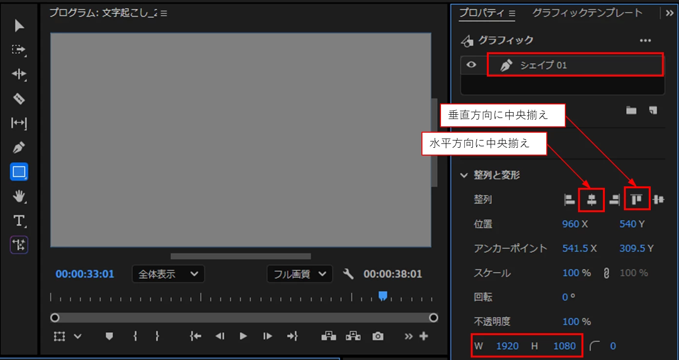 ②「シェイプ01」レイヤーを選択し、「整列と変形」項の「W」と「H」に「1920」と「1080」を入力し、「整列」項の「水平方向に中央揃え」と「垂直方向に中央揃え」を適用します。