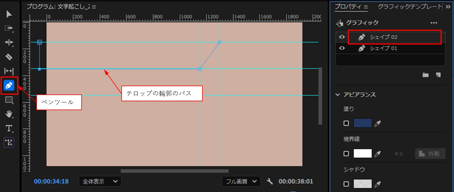 ①「ペンツール」で上側のテロップの背景のパスを描きます。