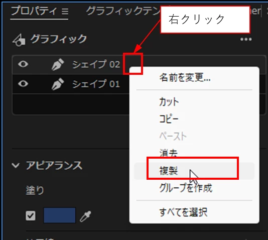 「シェイプ02」レイヤーの上で右クリックし、開いたコンテキストメニューから「複製」を選択します。