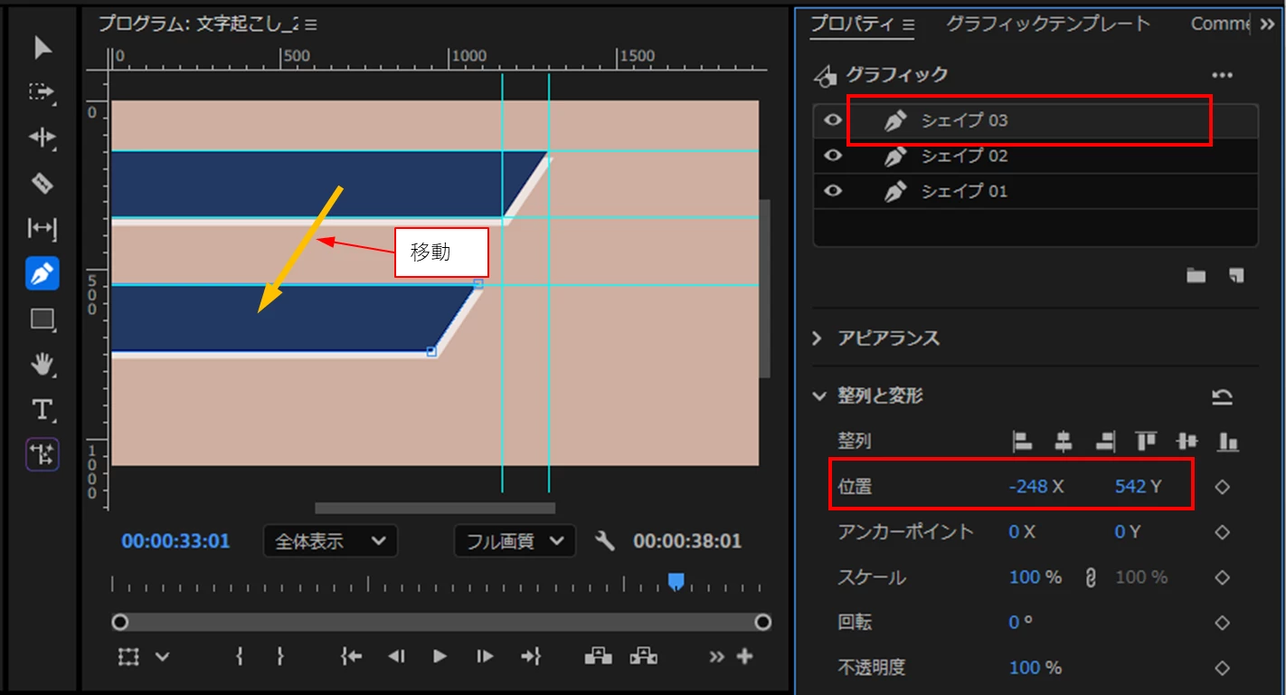 ⑤上側の「シェイプ02」レイヤー名を「シェイプ03」レイヤー名に変更し、レイヤーを選択したまま「整列と変形」項の「位置」の数値で下側のテロップ位置までガイドに合わせるように移動します。