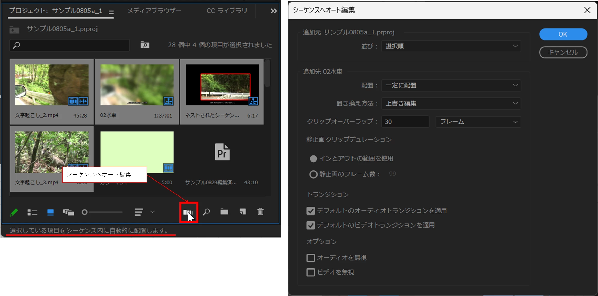 ③「プロジェクト」パネルの右下にある「シーケンスへオート編集」アイコンをクリックします(下左図)。または、メニューの「クリップ」→「シーケンスへオート編集」を選択します。