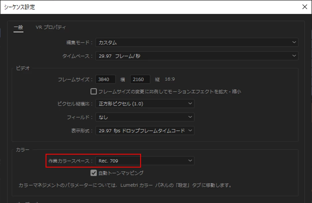 次に、メニューの「シーケンス」→「シーケンス設定」を選択して開いた「シーケンス設定」ウィンドウで「作業カラースペース」項が「Rec. 709」以外に設定されていたら「Rec. 709」に設定してみたらいかがでしょうか(下図赤枠部)。