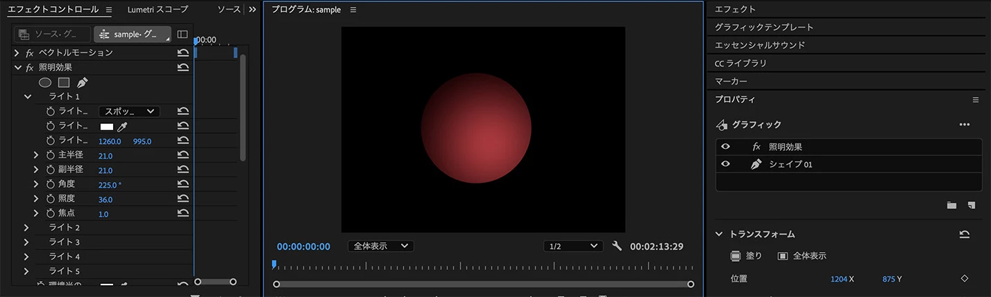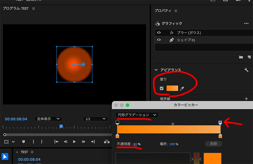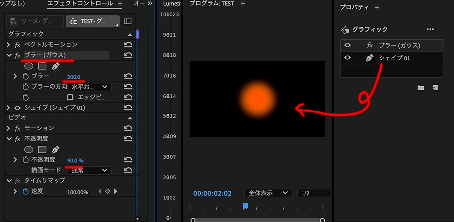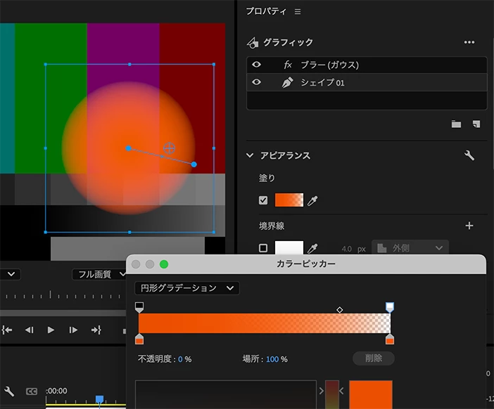 プレミアプロ(Ver.25.0.0)を使って図形(円など)の境界線を下の画像のようにぼかしたいのですが、