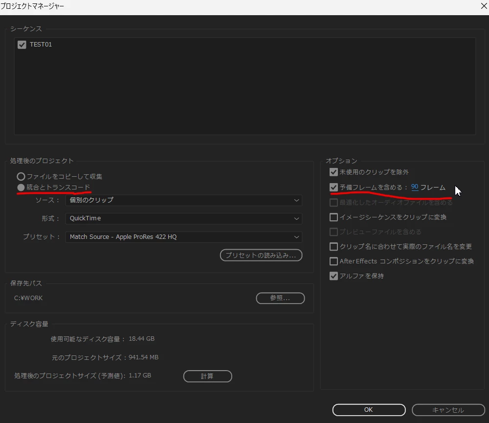 添付していただいた画像を拝見しますと、元のプロジェクトサイズ「54.58GB」に対して、処理後のプロジェクトサイズの予測値は「4.39GB」となっているので5GB弱となるはずなのですが、実際に書き出されたファイルが140GB以上になっていますでしょうか。