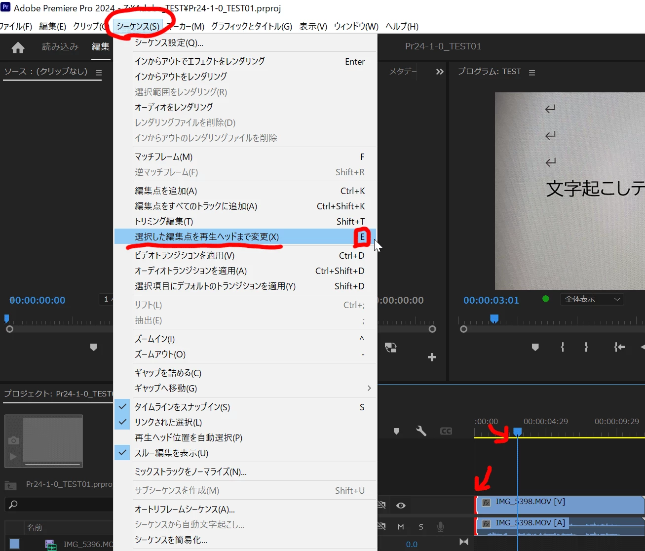 原因の切り分けのため、「シーケンス」メニューの中から「選択した編集点を再生ヘッドまで変更」が正常に動作するかご確認いただくといかがでしょうか。