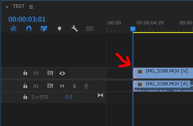 シーケンス上で編集点を選択し、再生ヘッドを少し移動させた状態で「選択した編集点を再生ヘッドまで変更」を実行します。