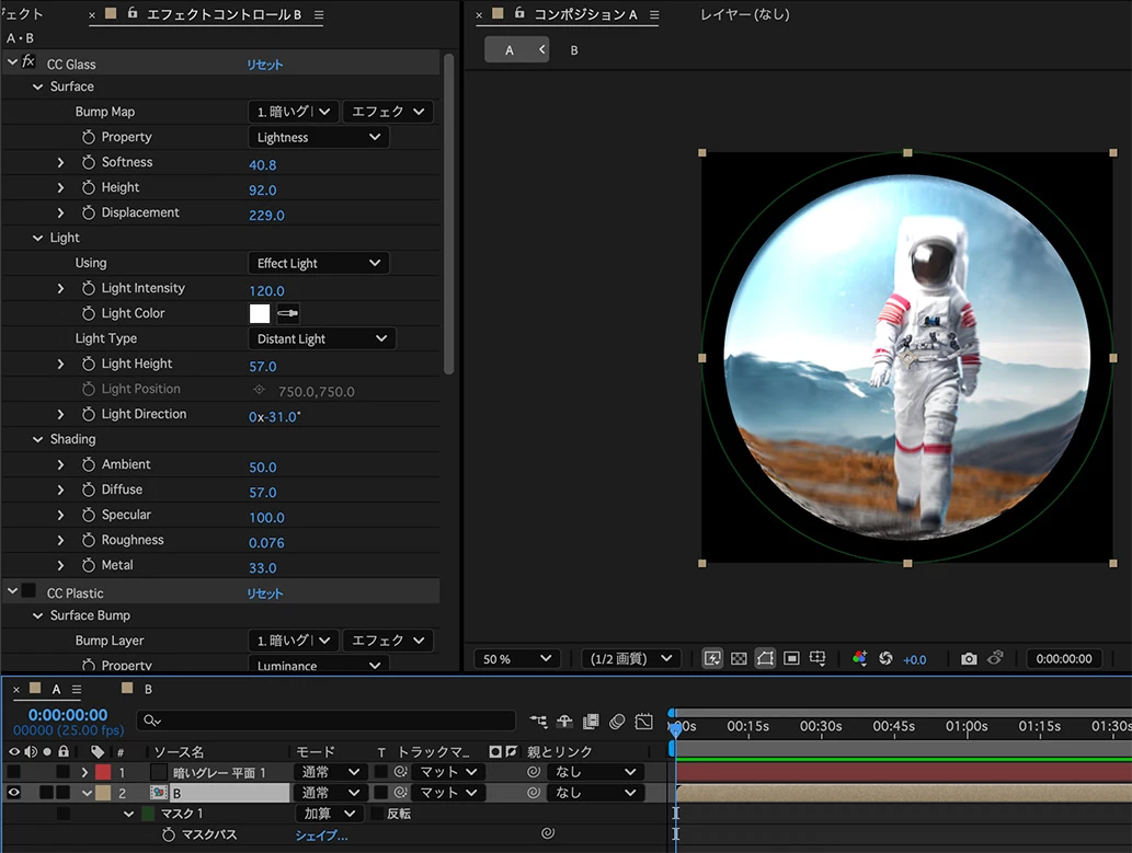 Photoshop・After Effectsのレイヤースタイルの「ベベルとエンボス」を適用した場合、円形の中央部分が平たいままなので、別の方法も提案しておきます。