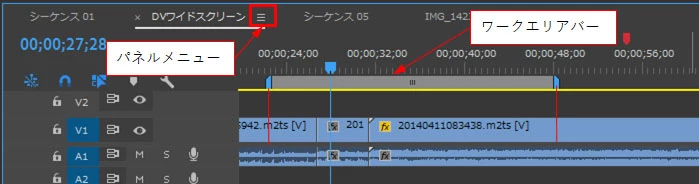 ワークエリアバーが表示されていない場合は、シーケンスのパネルメニューをクリックして開き「ワークエリア」を選択します。